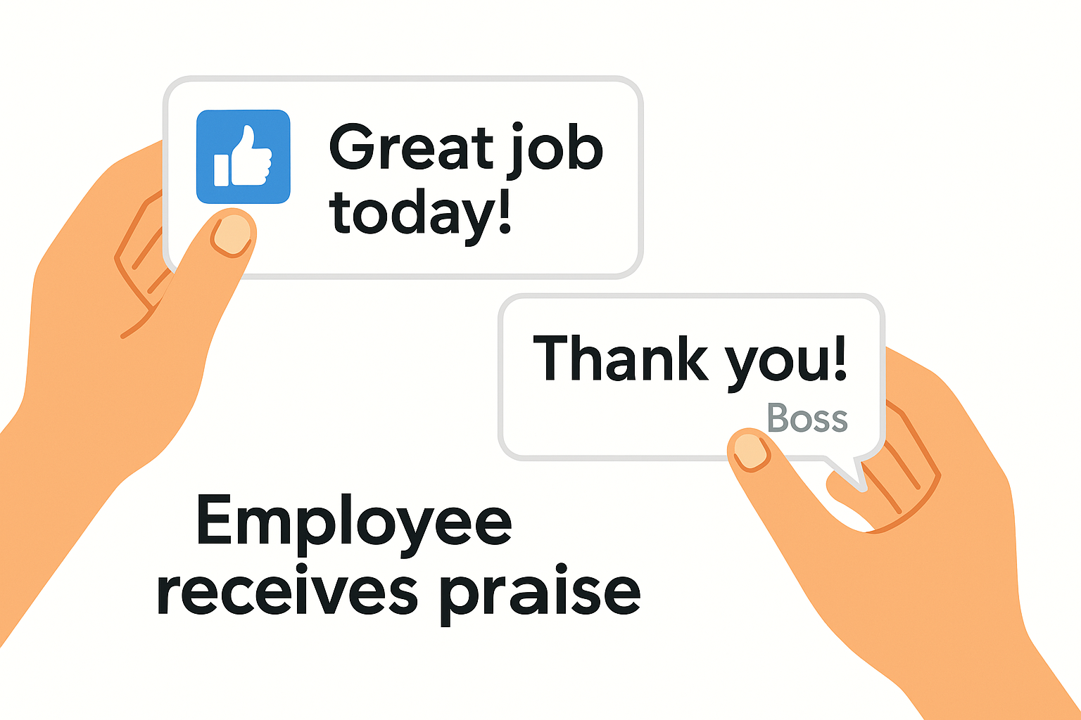 A cheerful illustration depicting hands exchanging praise messages, ideal for employee recognition programs or motivational content.