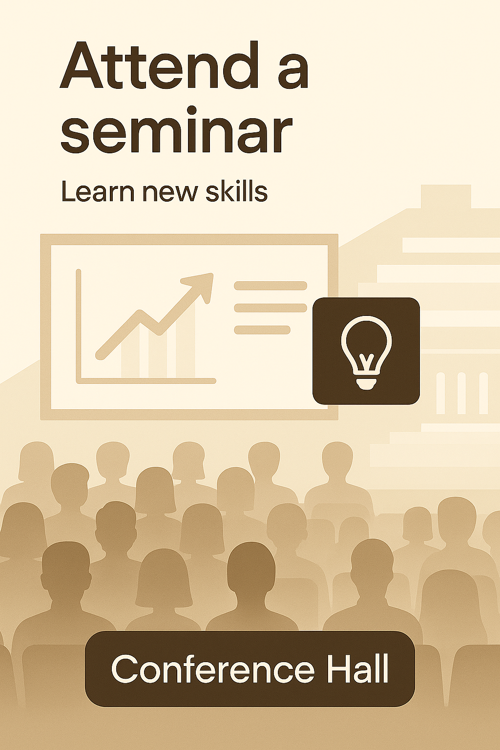 /Collection: /by davooda/Type: PNG/Stylish promotional graphic designed to encourage attendance at a seminar, featuring a simplified audience silhouette and a lightbulb icon symbolizing learning and skill development.