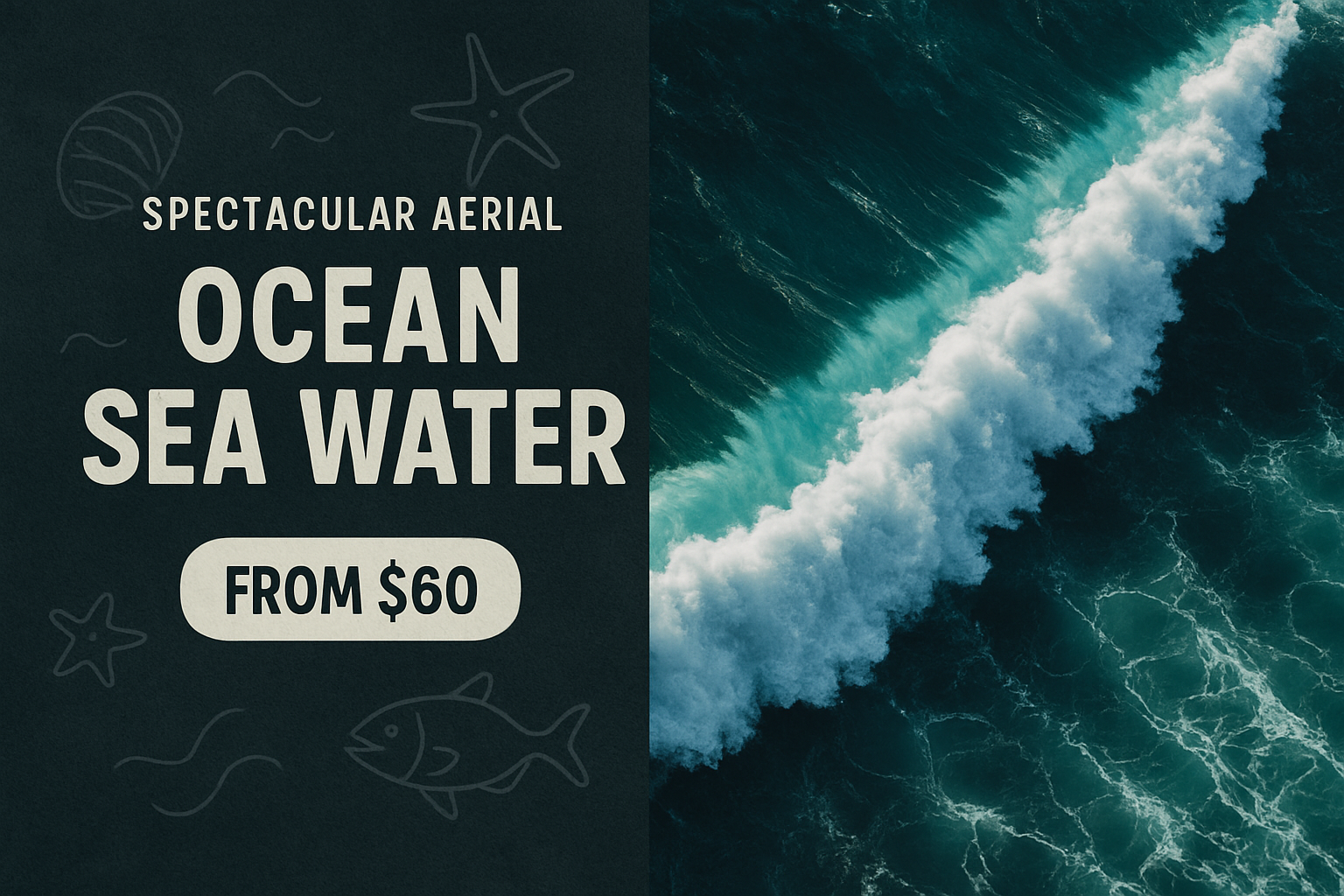 /Collection: /by davooda/Type: PNG/A stunning aerial shot of ocean waves crashing against each other, complemented by a bold, modern advertisement layout featuring typographic elements and a price tag.
