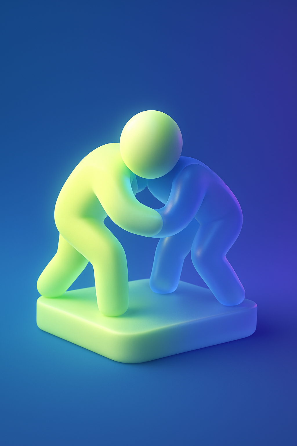 A simple 3D icon depicting two stylized wrestlers in a dynamic pose, illuminated by a soft glow. The colors include light yellow-green, solid blue, and violet, creating a striking visual effect.