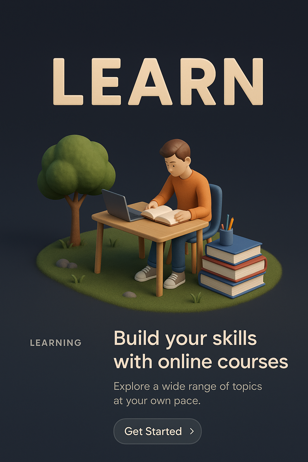 A visually appealing 3D scene depicting a student learning at a desk, surrounded by books and a tree. The design emphasizes a dark gradient background with clear text elements.