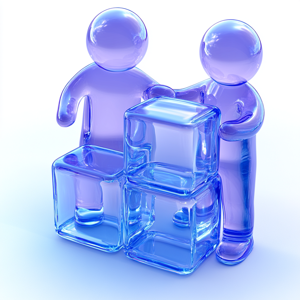 /Collection: /by davooda/Type: PNG/A visually engaging 3D depiction of two stylized figures stacking transparent cubes, representing teamwork or construction concepts. Ideal for use in digital design projects.