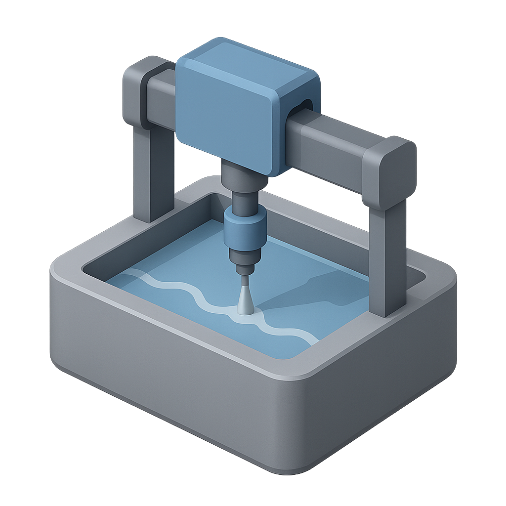 A stylized 3D icon representing a waterjet cutting machine. It features a blue nozzle above a shallow tank with water, presented in a three-quarter isometric view.