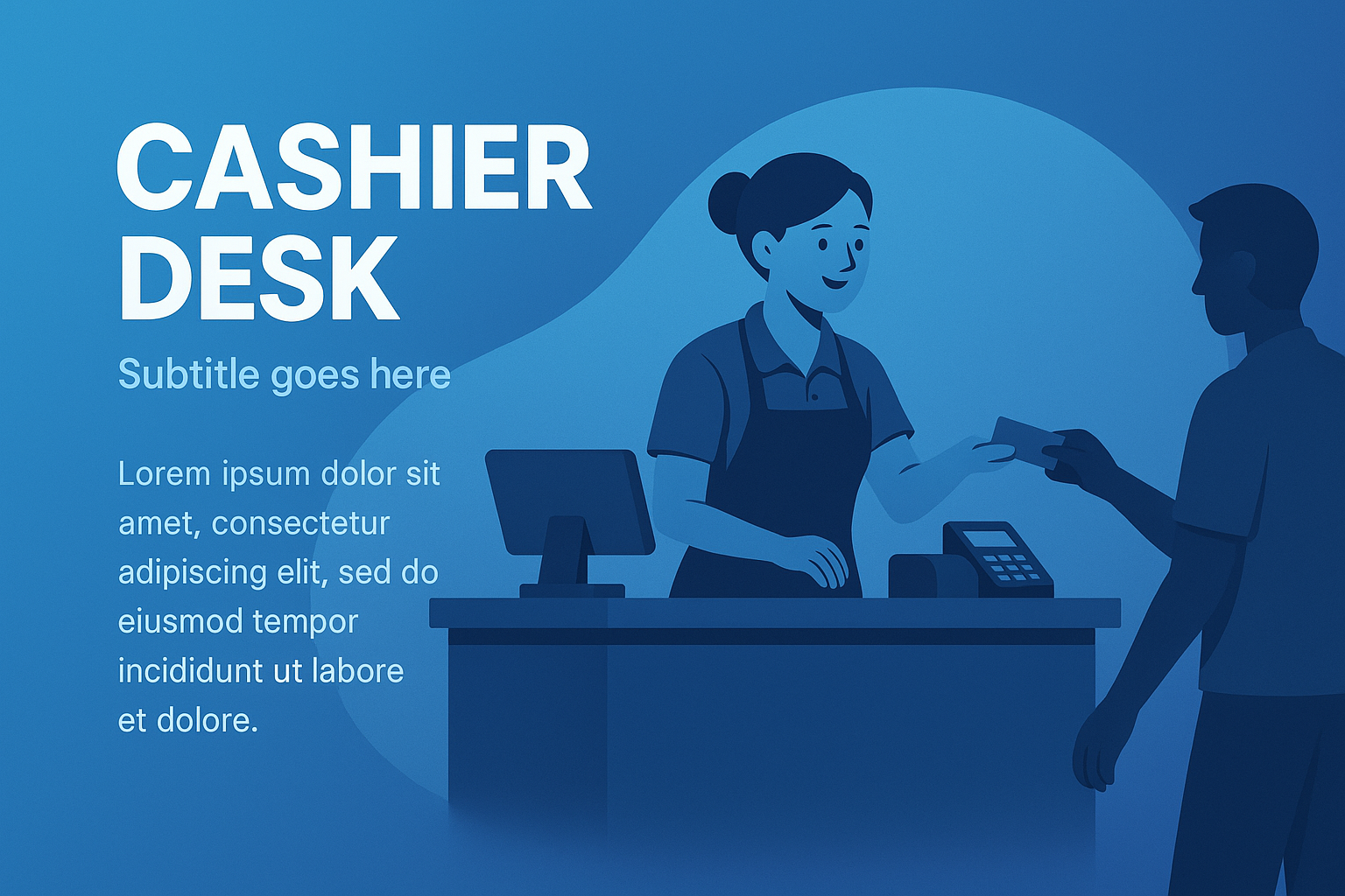 /Collection: /by davooda/Type: PNG/An engaging illustration of a cashier desk featuring a gradient background. A cashier interacts with a customer, showcasing a friendly atmosphere. The design includes clear text elements and a balanced composition.
