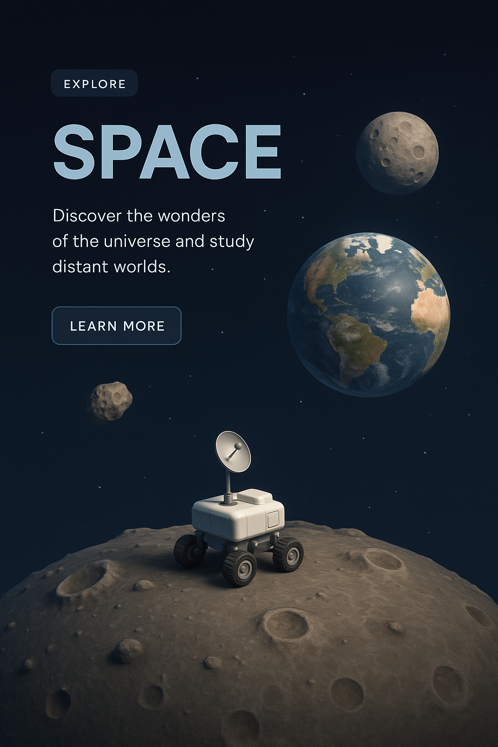 A captivating 3D scene showcasing a lunar rover on the moon's surface, surrounded by planets and asteroids. The design incorporates a dark gradient background with eye-catching details.
