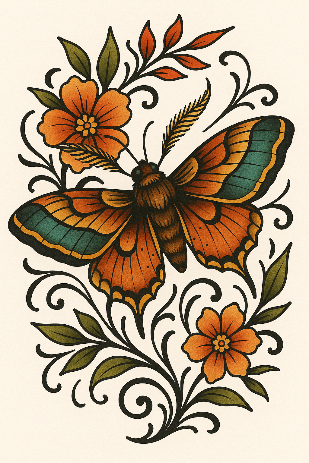 A beautifully illustrated tattoo design featuring a vibrant butterfly surrounded by floral elements. The artwork combines bold colors and intricate details, making it ideal for tattoo enthusiasts and art lovers.