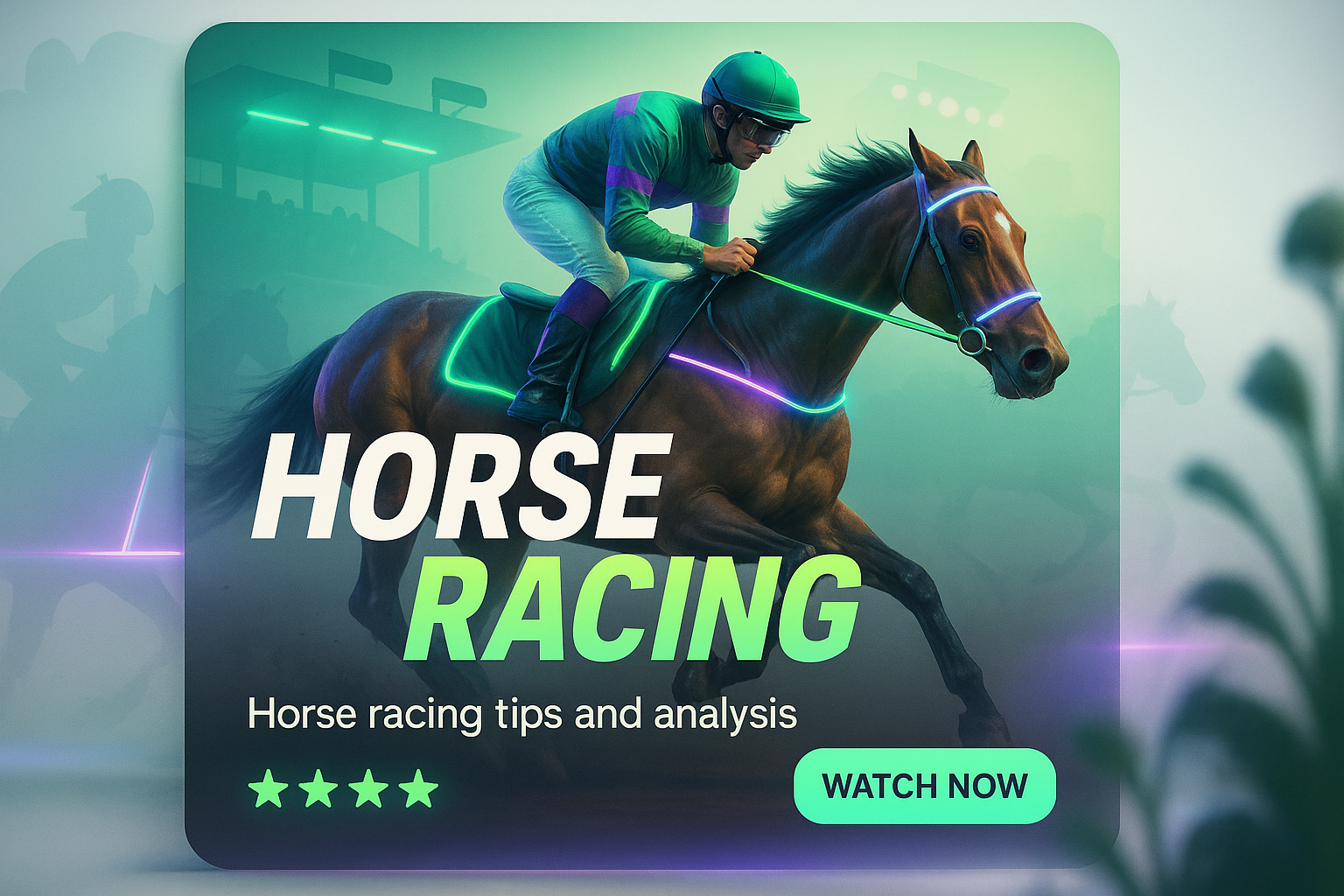 Vibrant promotional graphic for horse racing tips featuring a dynamic rider and horse, designed for digital marketing in sports and betting.