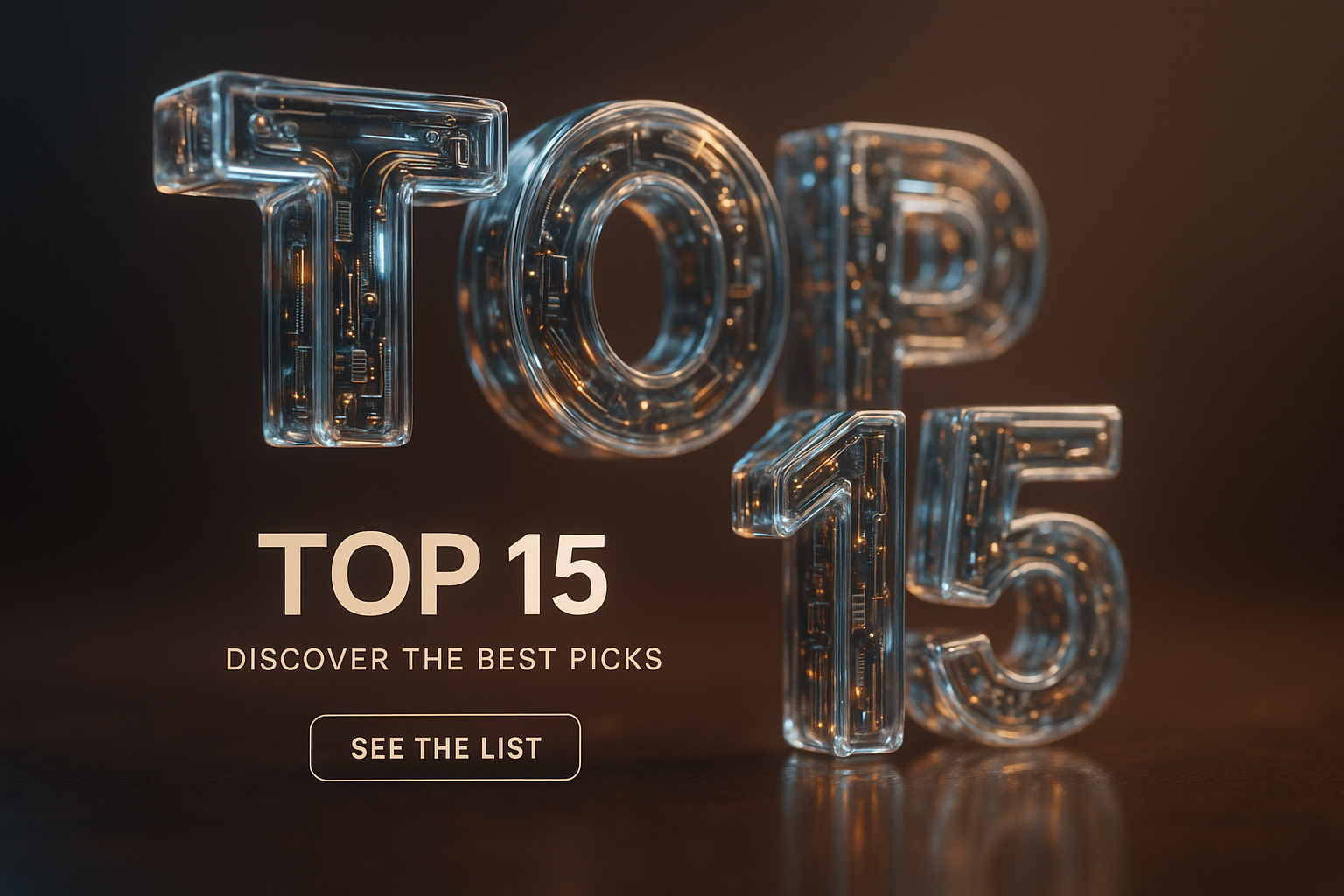 /Collection: /by davooda/Type: PNG/A captivating 3D scene featuring the text 'TOP 15' crafted from transparent materials, revealing intricate LED details. The ambient lighting enhances its stunning reflections and depth.