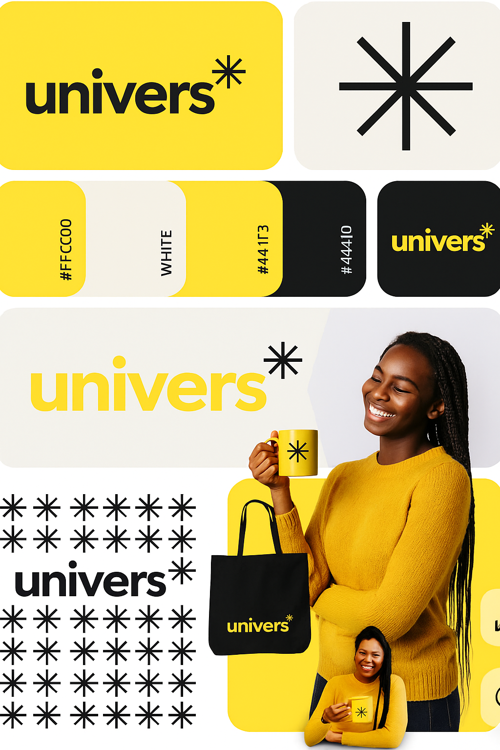 An engaging branding layout featuring geometric shapes, vibrant yellow and black colors, and a smiling model holding branded merchandise, showcasing a fresh design aesthetic.