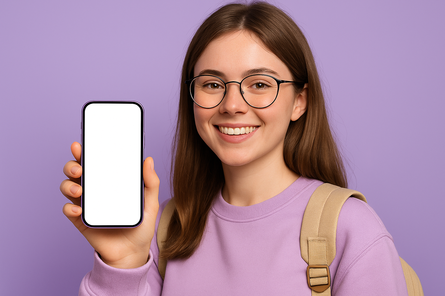 /Collection: /by davooda/Type: PNG/A young female student wearing a purple sweatshirt and glasses holds a smartphone with a blank screen against a solid purple background, exuding a friendly smile.