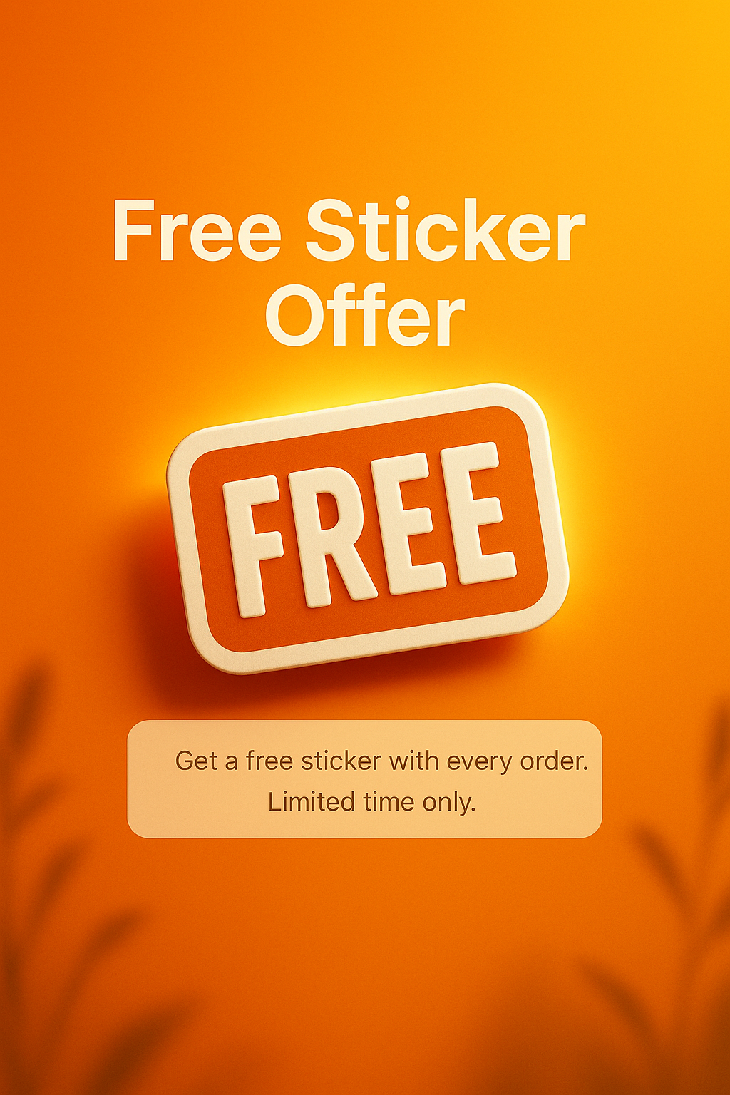This is a promotional graphic featuring a free sticker offer. The vibrant orange background and bold text highlight the key message, aimed at attracting customers. Ideal for marketing campaigns.