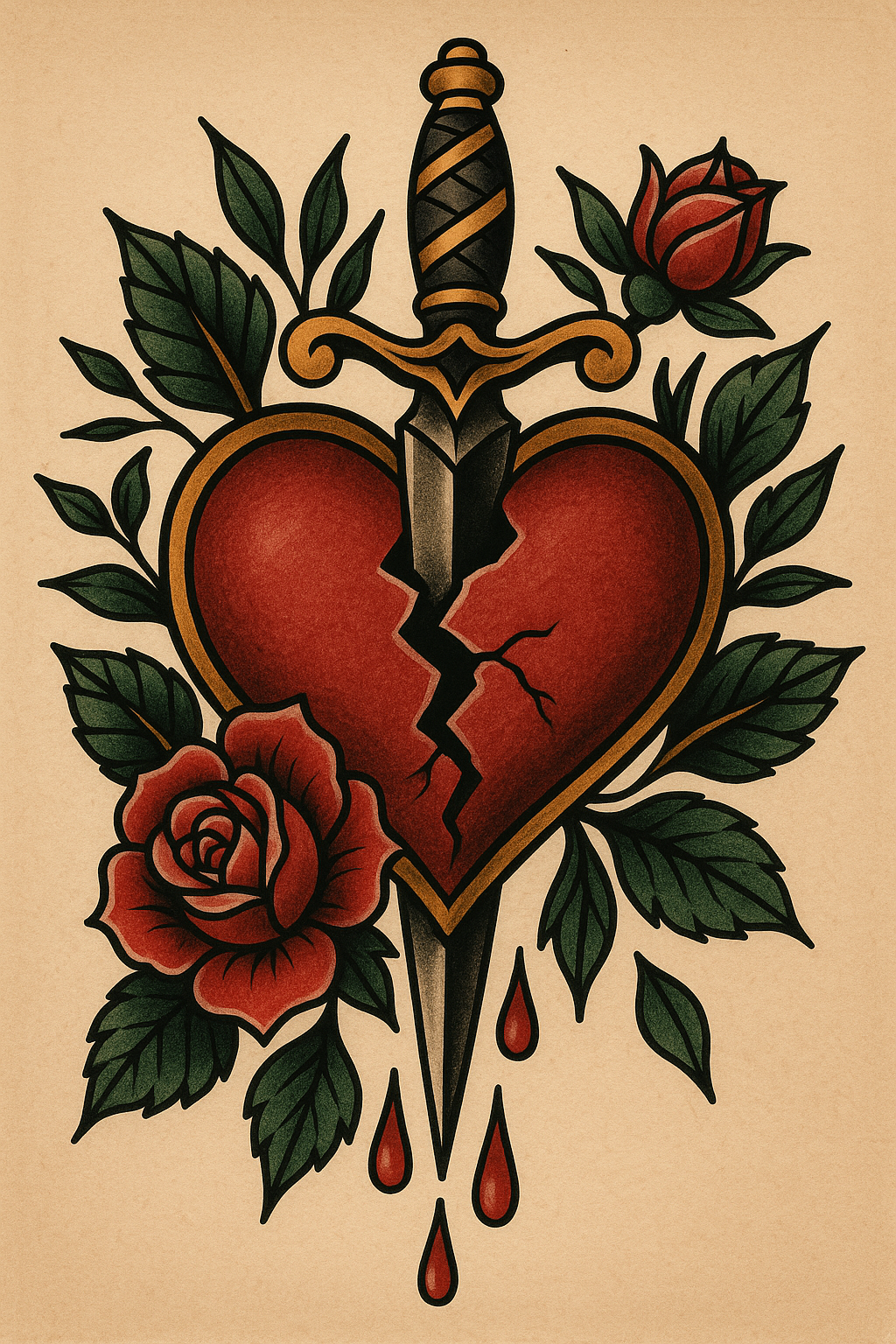 This image showcases a tattoo-style illustration of a broken heart pierced by a sword, surrounded by roses and leaves. It features bold colors and outlines, ideal for tattoo design inspiration.