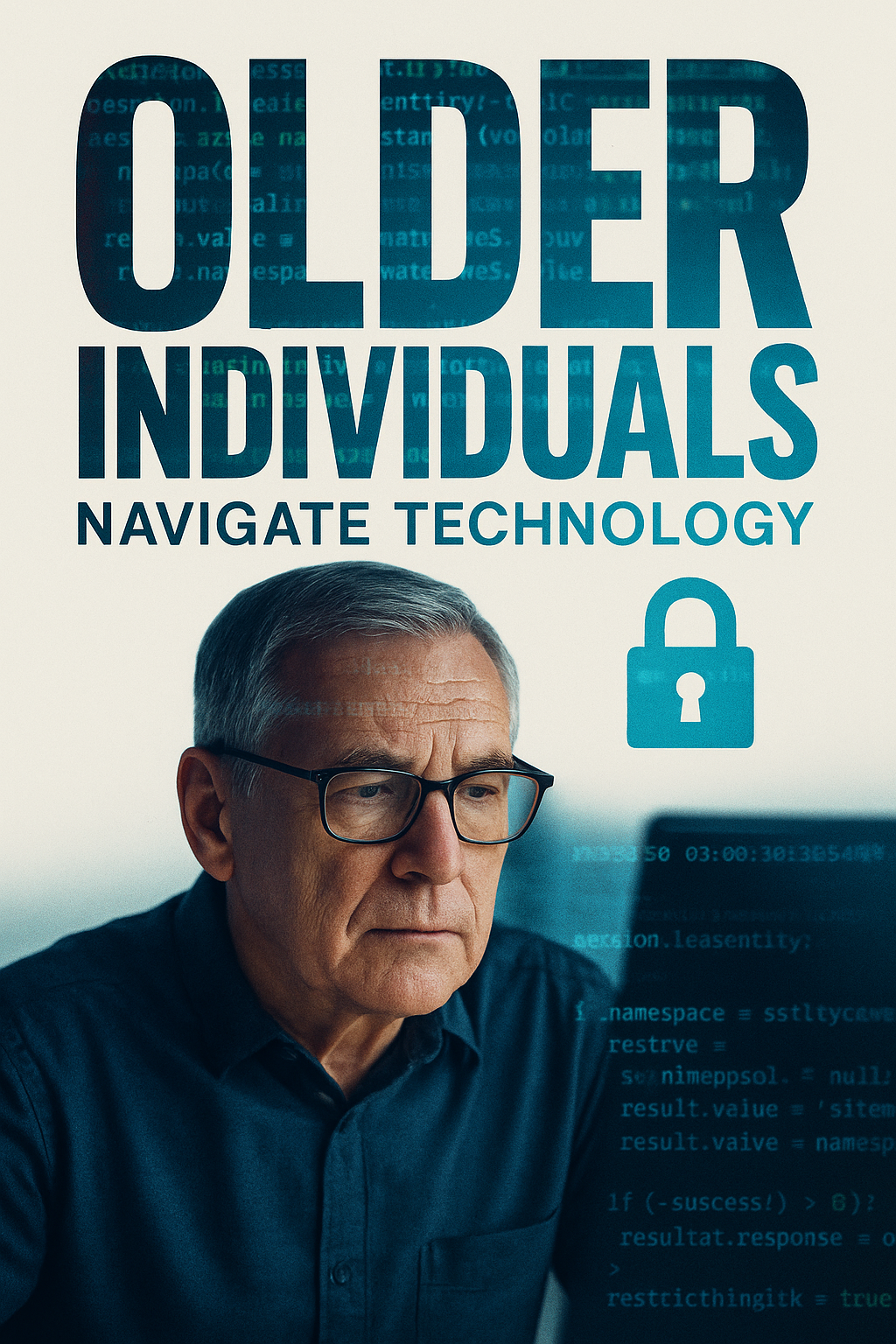 /Collection: /by davooda/Type: PNG/A visually engaging graphic highlighting older individuals using technology, featuring a thoughtful individual with a modern design and a tech-inspired background, ideal for educational or promotional materials on tech literacy for seniors.