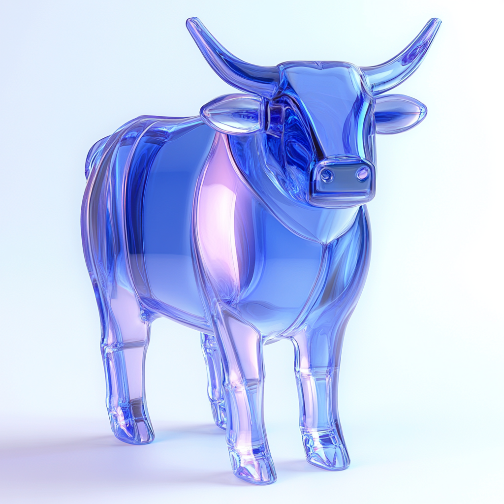 A modern glass sculpture of a bull, featuring a unique blue gradient and smooth curves. Ideal for decorative purposes in contemporary settings.