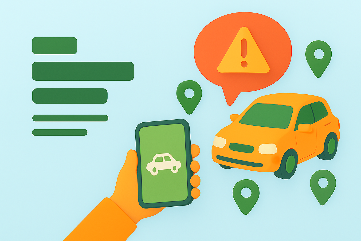 /Collection: /by Sergey Leonov/Type: PNG/A vibrant illustration depicting a hand holding a smartphone with a car icon, alongside a stylized car and location markers, ideal for tech or automotive apps.