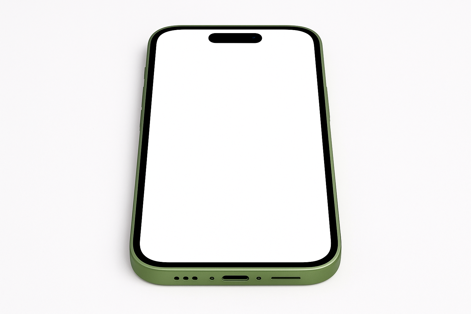 A top view of a sleek green smartphone resting on a white surface. The phone features a white screen and rounded edges, highlighting its modern design.