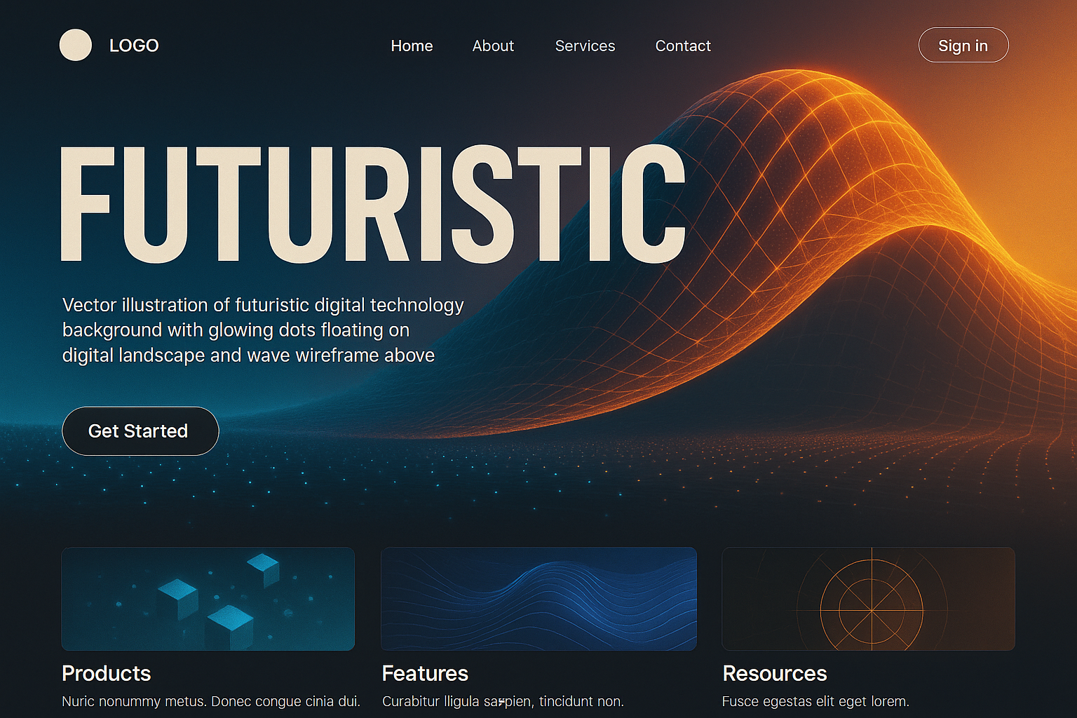 /Collection: /by davooda/Type: PNG/A visually striking landing page featuring a futuristic digital landscape with glowing dots and wave wireframe. Oversized bold typography and action buttons enhance user engagement.
