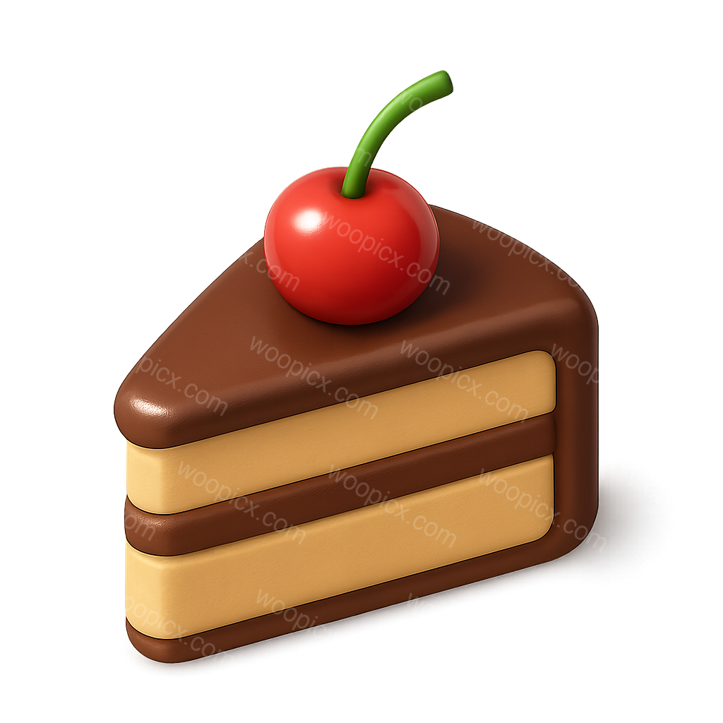A visually appealing 3D slice of cake featuring layers of cream and topped with a vibrant cherry. The design has a smooth, volumetric quality and is shown in an isometric perspective.