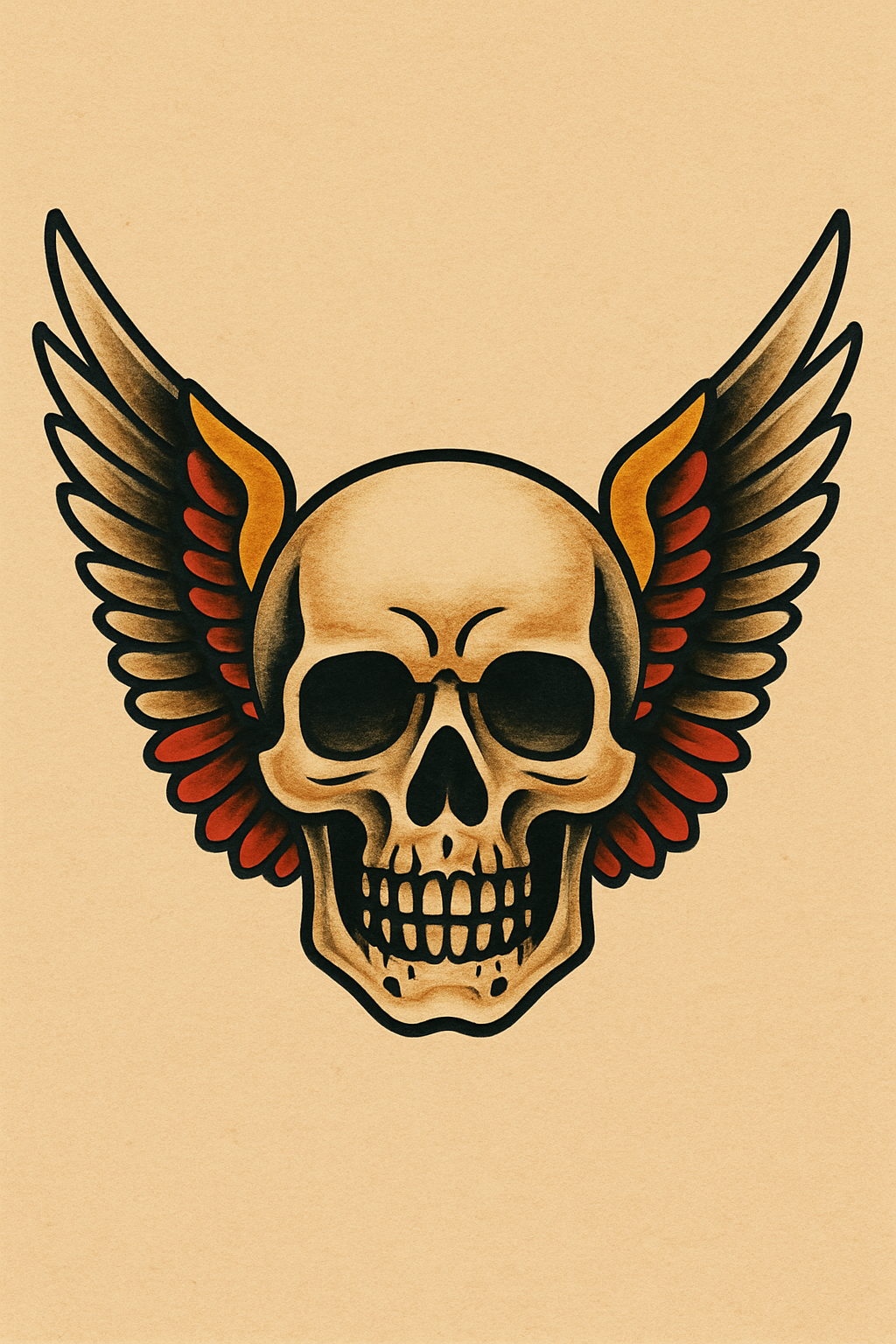 This image features a stylized skull with vibrant wings, showcasing a tattoo art style. The design is bold and graphic, appealing to tattoo enthusiasts and those seeking edgy artwork.