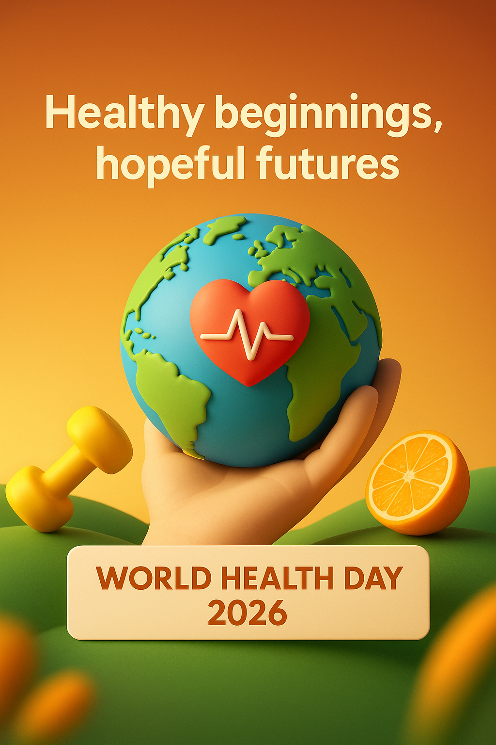 A vibrant promotional graphic for World Health Day 2026, featuring a hand holding a globe with a heart and a heartbeat line, symbolizing global health and wellness. It uses bright colors and a playful design.