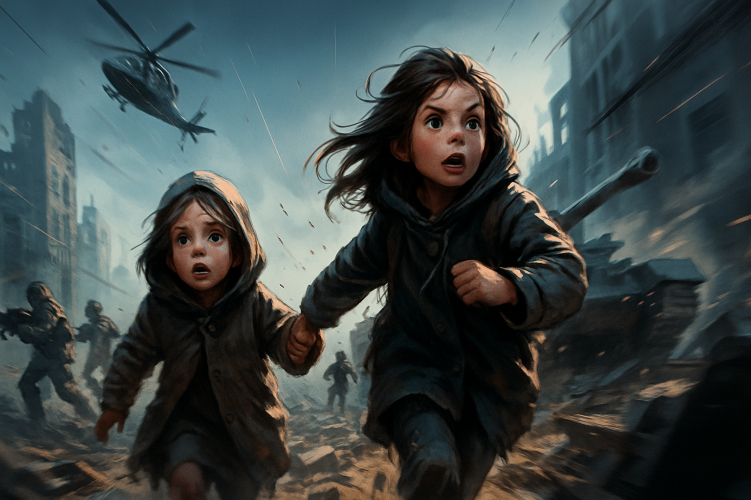 /Collection: /by davooda/Type: PNG/This digital artwork illustrates two children fleeing through a devastated urban landscape, showcasing a dramatic and emotional scene. The style is cinematic and intense, aimed at evoking empathy and awareness of conflict.