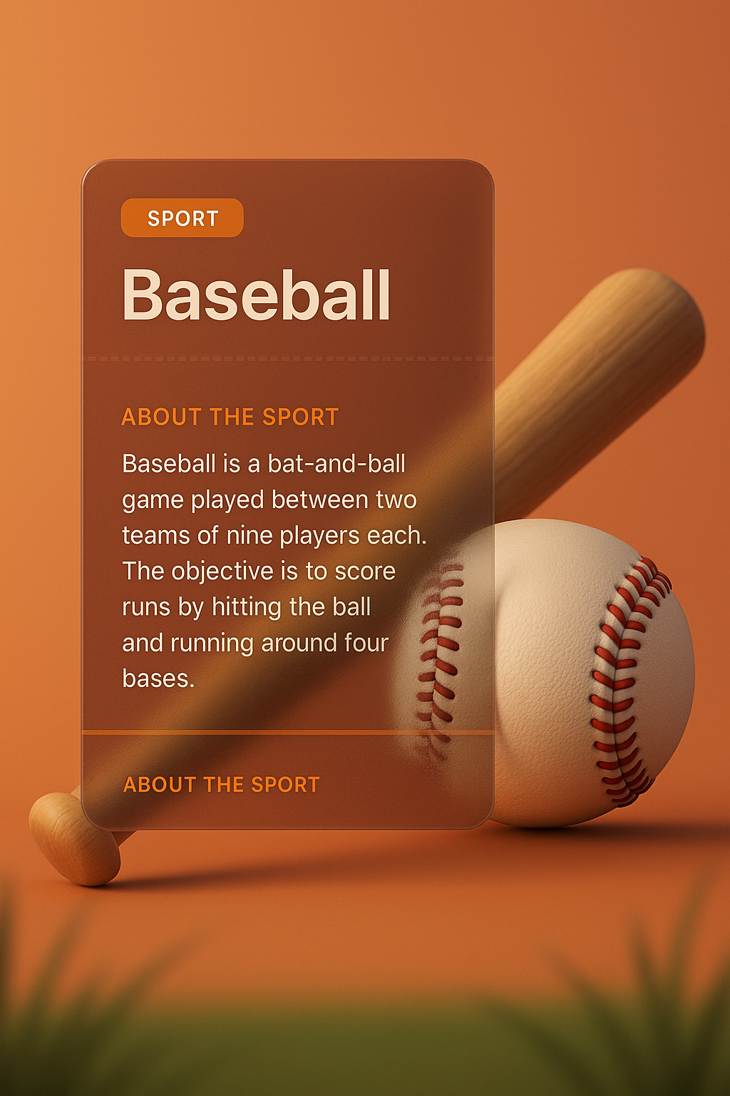 A visually engaging 3D design featuring a baseball and bat, complemented by a transparent overlay card displaying information about the sport. The warm background enhances the overall aesthetic.