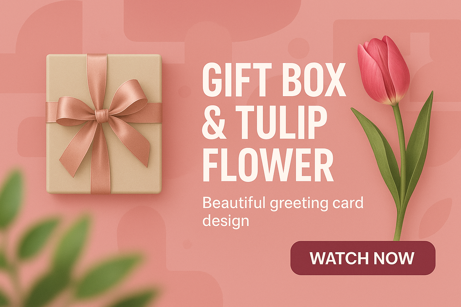 Stylish greeting card graphic showcasing a gift box and tulip flower with soft colors, ideal for spring or special occasion promotions.