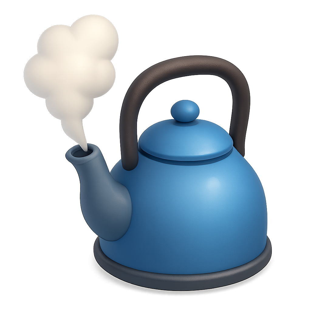 A visually appealing 3D icon of a kettle with steam rising, showcasing a vibrant blue color and a glossy finish. The kettle is designed in a three-quarter view with an isometric perspective.
