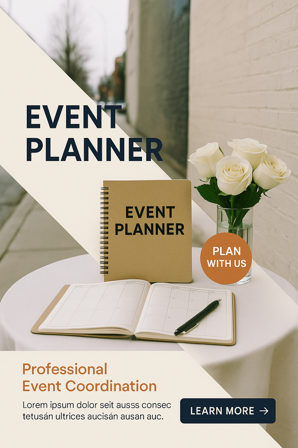 The image features a stylish event planner setup with a notebook, flowers, and a table. It emphasizes layered composition and realism, showcasing an inviting atmosphere for planning.