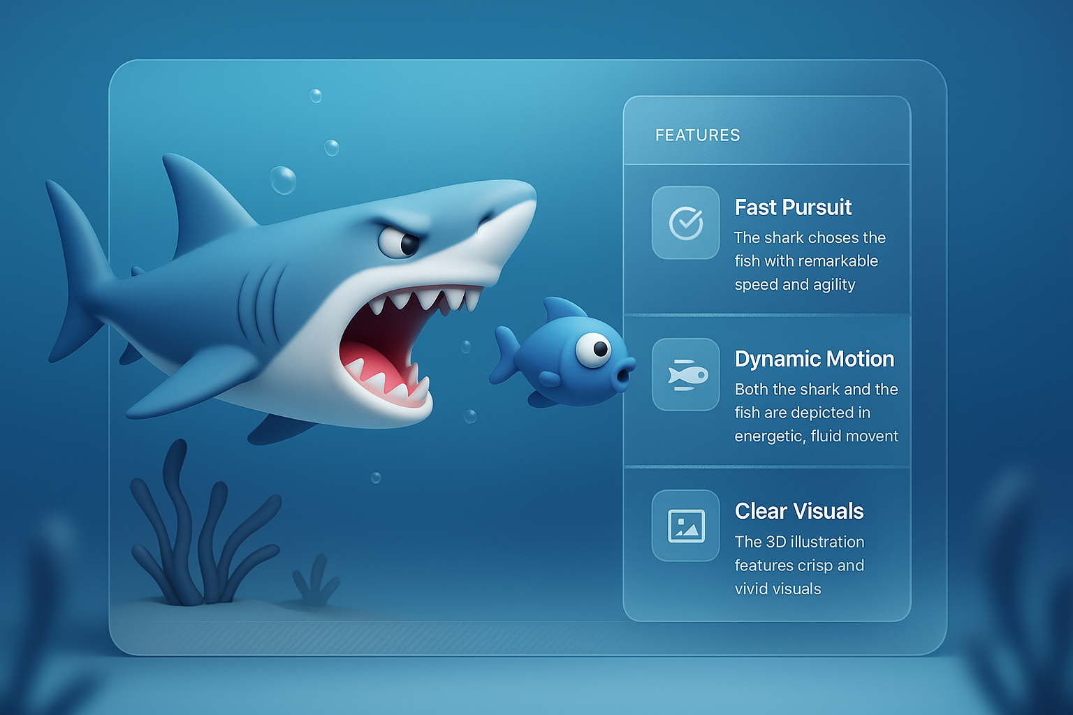 /Collection: /by davooda/Type: PNG/A vibrant 3D illustration of a shark energetically pursuing a small fish. The design includes visual blocks detailing features like fast pursuit and dynamic motion, enhancing the scene's depth.