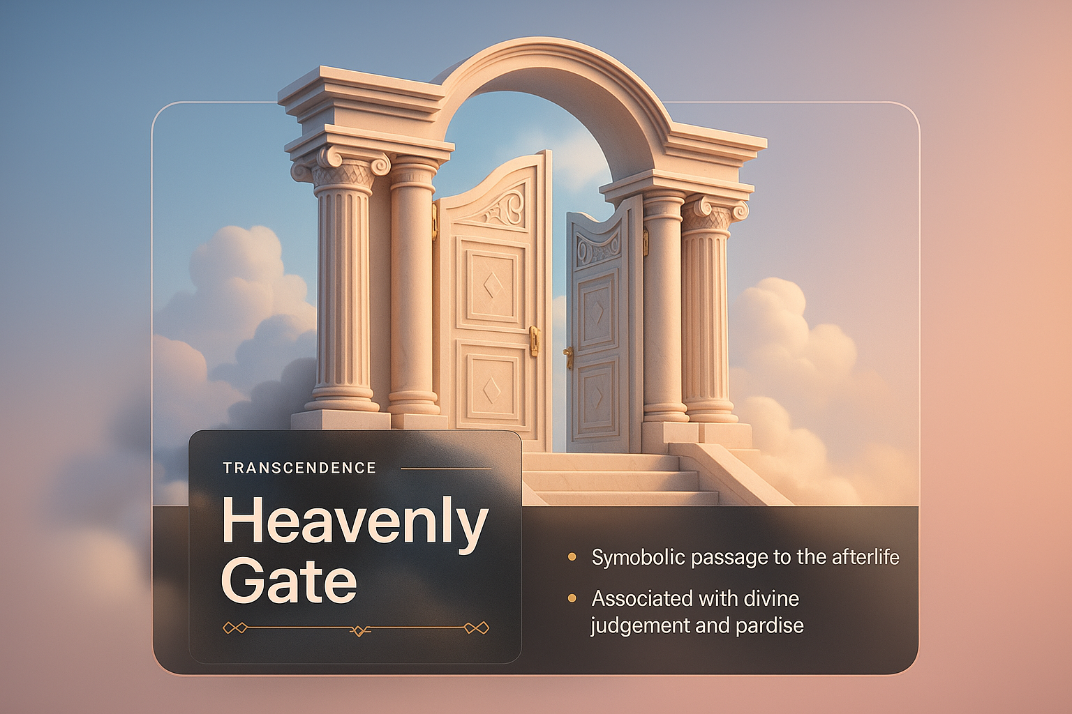 A stunning 3D illustration of a heavenly gate, symbolizing a passage to the afterlife. The design features elegant columns and a dark overlay with text.