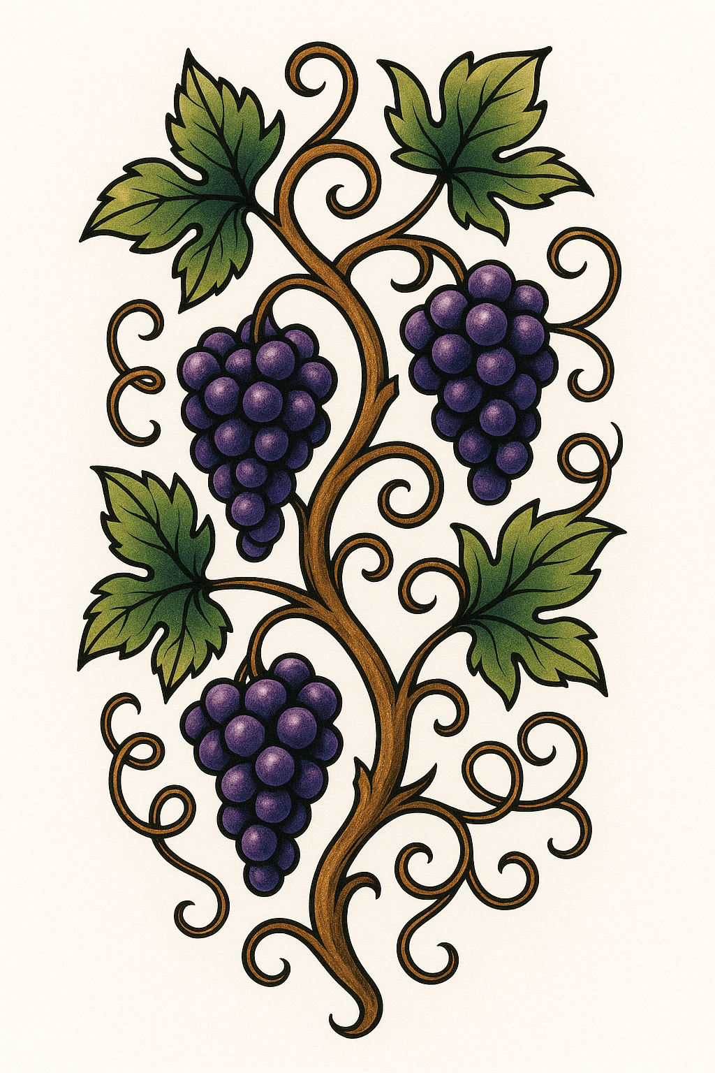 /Collection: /by davooda/Type: PNG/A vibrant illustration featuring grape vines adorned with lush green leaves and clusters of purple grapes, ideal for use in wine-related branding or decorative purposes.
