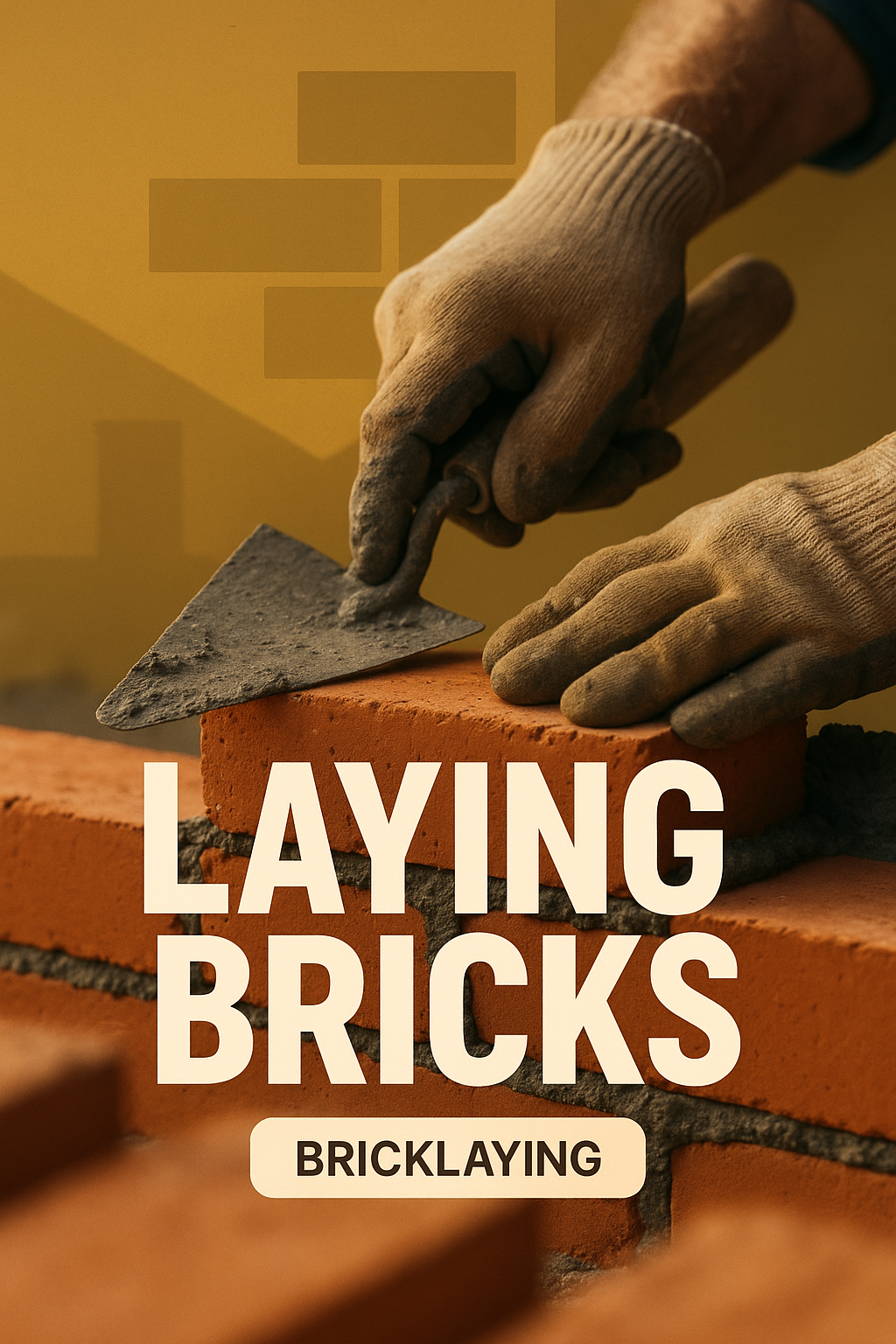 Dynamic construction image showcasing a craftsman laying bricks with a trowel. The design features warm tones and emphasizes hands-on work, ideal for educational or promotional content in construction.