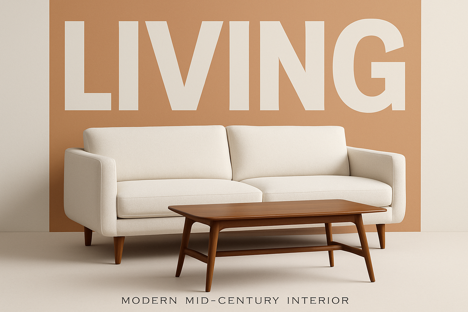 /Collection: /by davooda/Type: PNG/A modern mid-century interior featuring a white sofa and wooden coffee table against a large, bold text backdrop. The design is minimalistic yet striking, with a balanced layout.