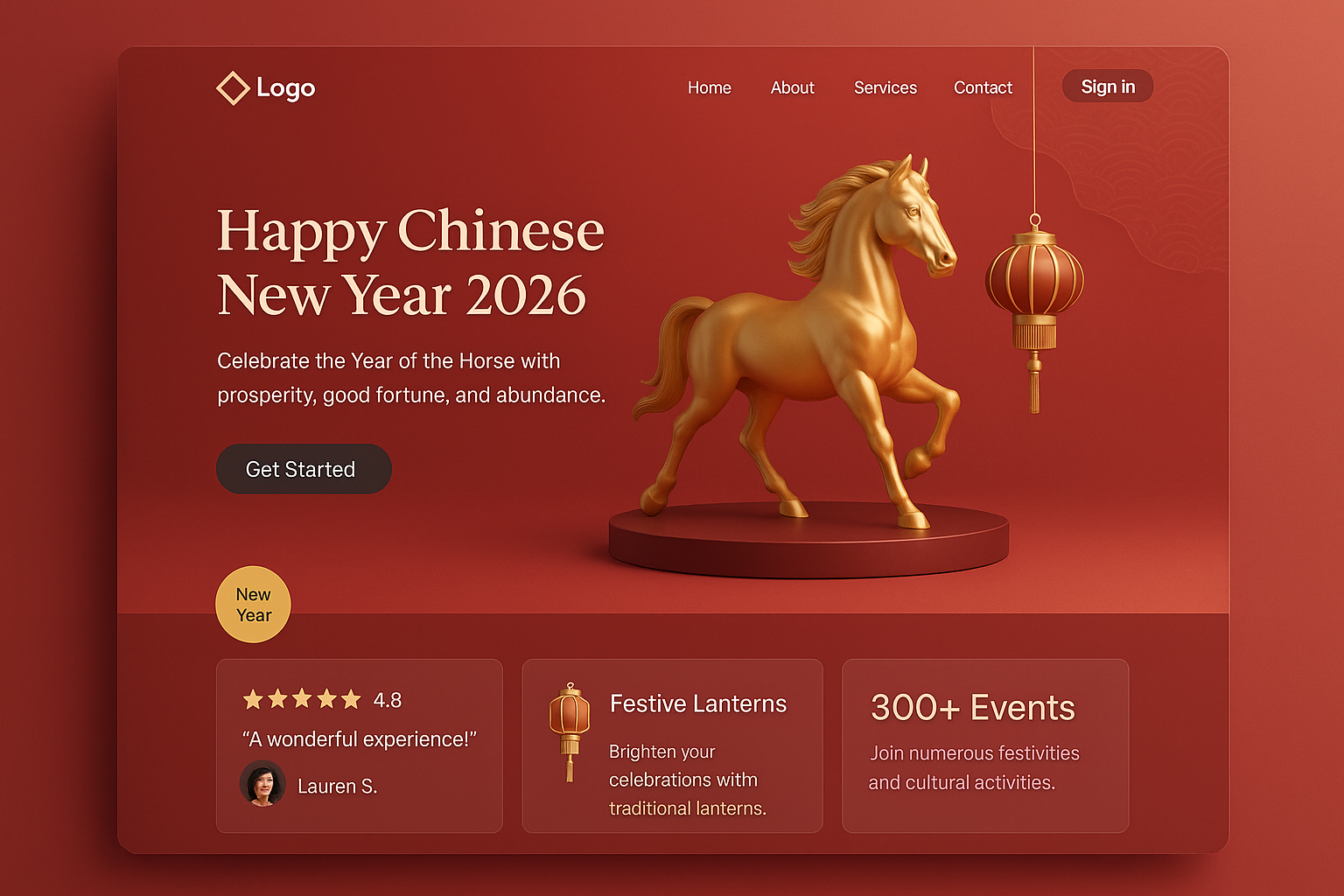 /Collection: /by davooda/Type: PNG/A vibrant landing page design for New Year 2026, featuring a 3D horse statue, festive lanterns, and a user-friendly layout with sections for features and testimonials.