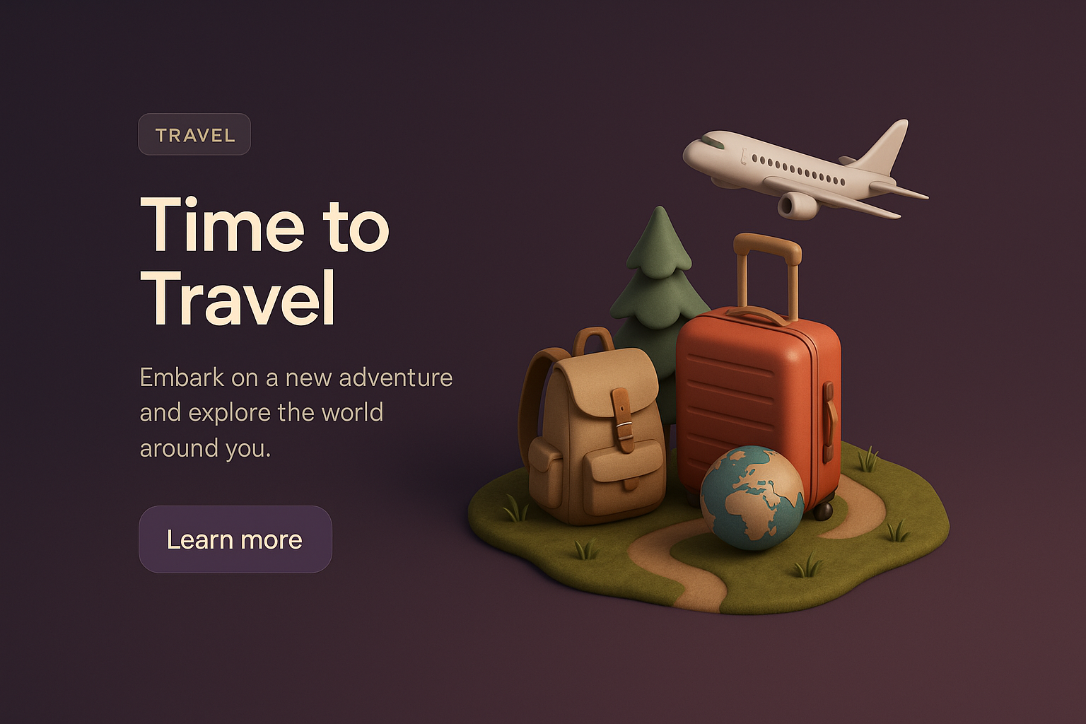 This vibrant 3D scene depicts travel elements including suitcases, a globe, and a plane, set against a smooth gradient background, inviting exploration.