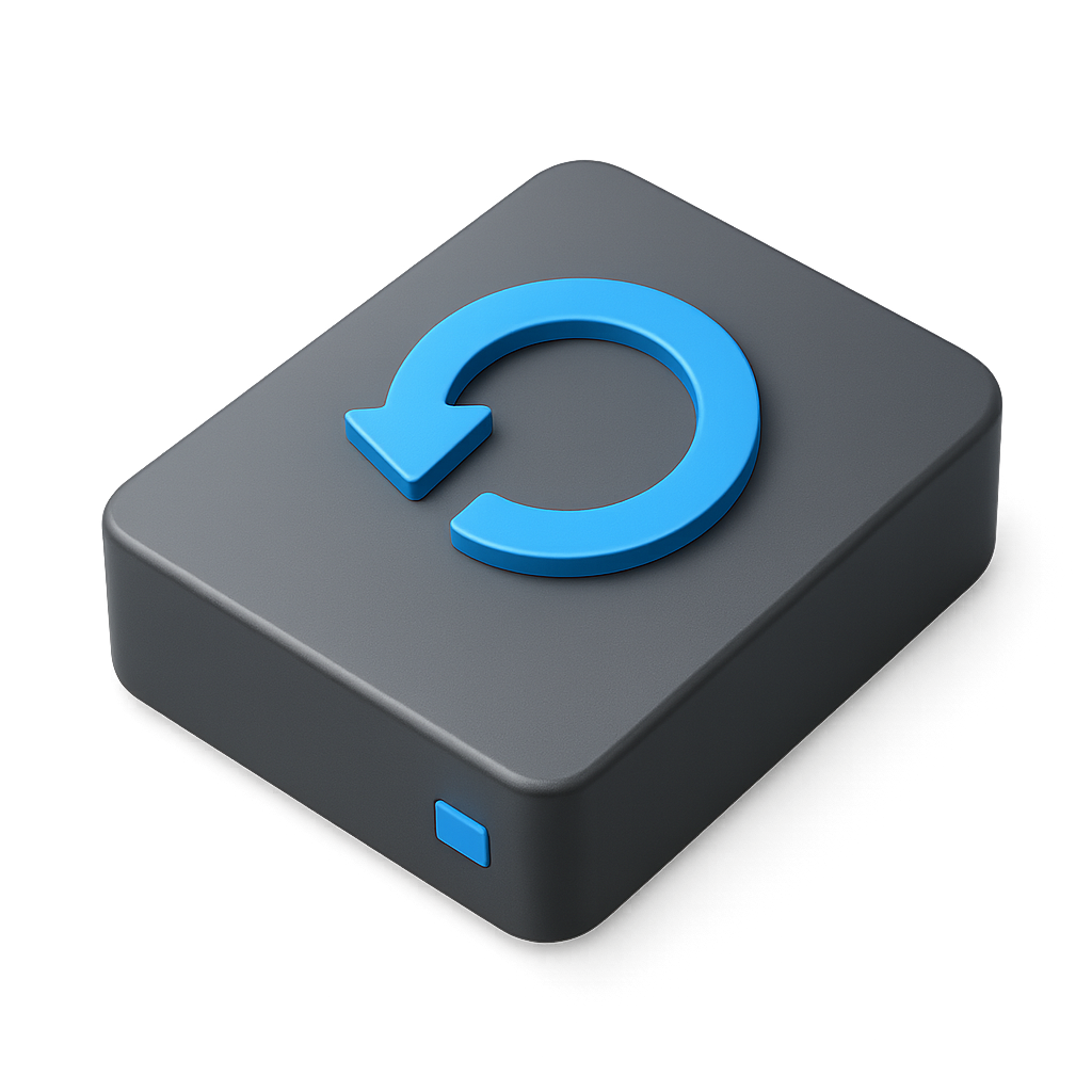 A sleek 3D icon representing a backup drive, featuring a blue circular arrow on a dark gray background. The design emphasizes a modern and isometric style.