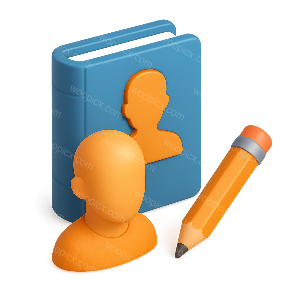 A vibrant 3D icon featuring a stylized human figure, a book, and a pencil, all designed in a volumetric style with a three-quarter view and a transparent background.