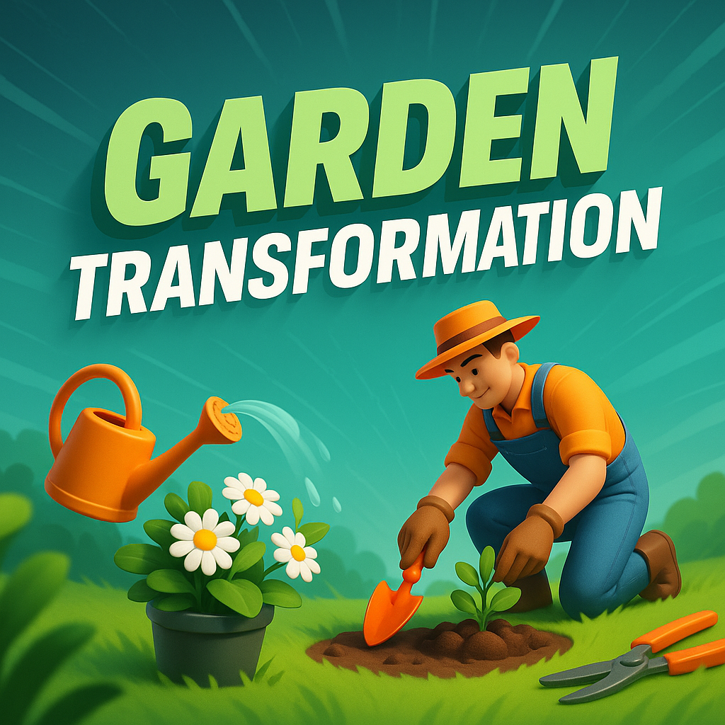 This vibrant graphic depicts a gardener engaging in garden transformation, featuring tools and plants. Ideal for gardening content and social media posts.