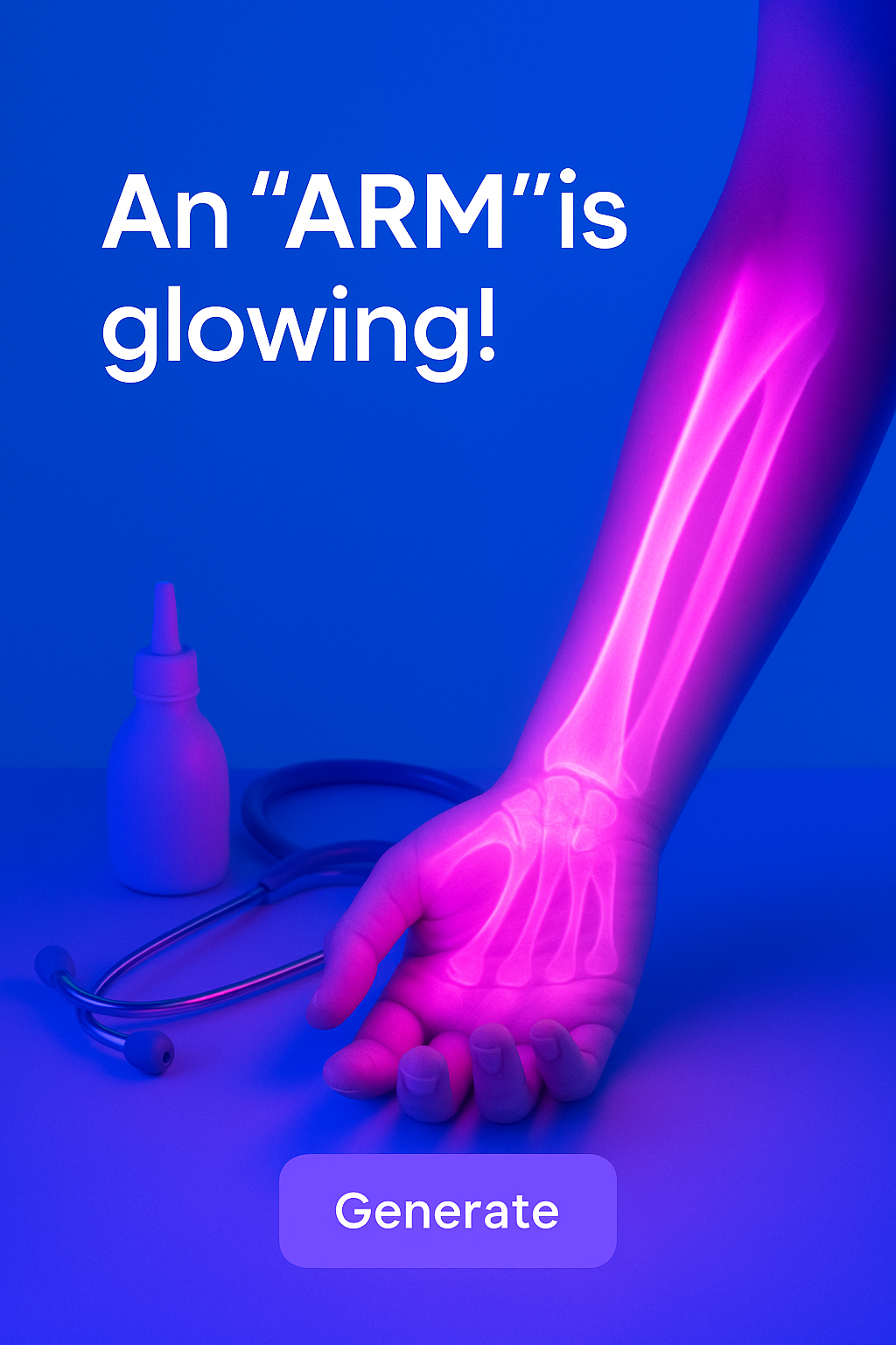 /Collection: /by davooda/Type: PNG/A vibrant design featuring a glowing arm radiating an intense neon-pink light. The arm is set against a solid blue background, creating a striking contrast. A medical bottle and stethoscope are subtly included, enhancing the thematic connection.