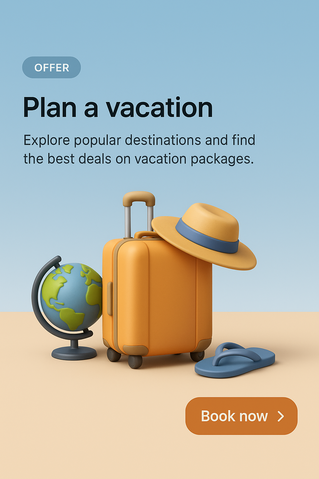 A detailed 3D illustration depicting vacation planning elements, including a globe, suitcase, hat, and sandals. The design features a smooth gradient background and clear text for easy reading.