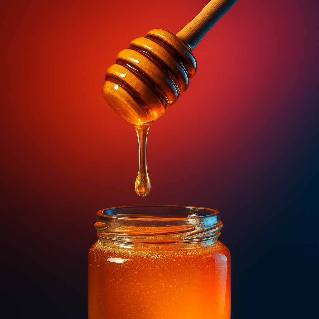 A stunning depiction of honey dripping from a wooden spoon, suspended in mid-air. The background features a smooth gradient of vibrant colors, enhancing the realism of the scene.