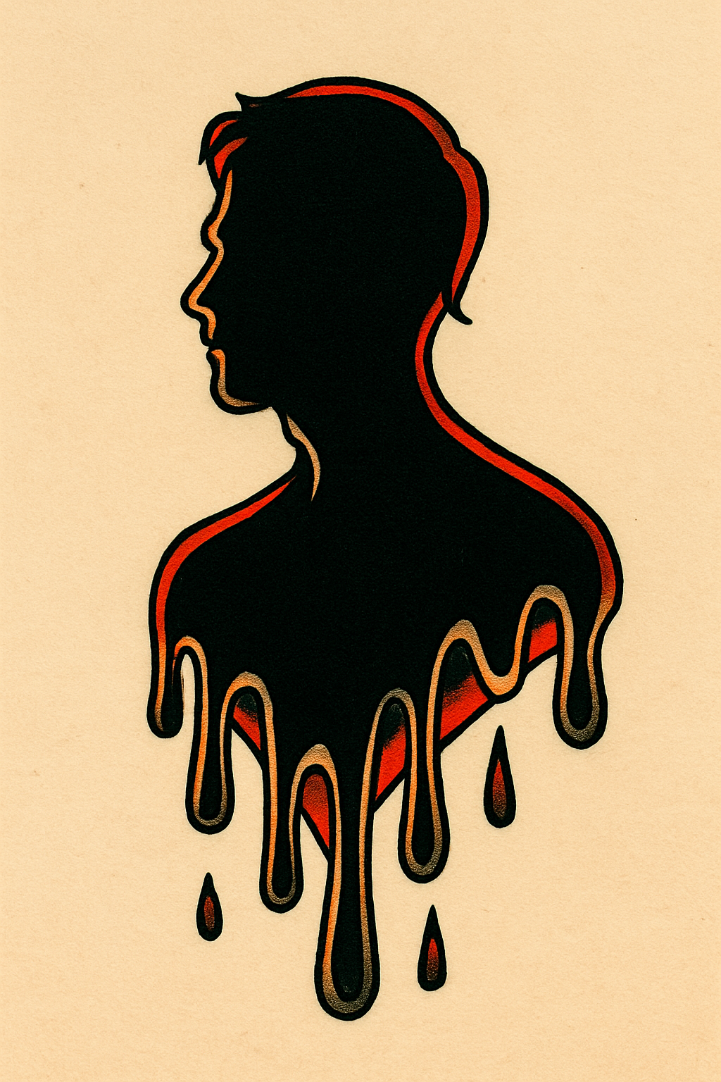/Collection: /by davooda/Type: PNG/A striking tattoo design featuring a silhouette of a person with black liquid dripping from the body. The artwork is in multiple colors against a light beige background.