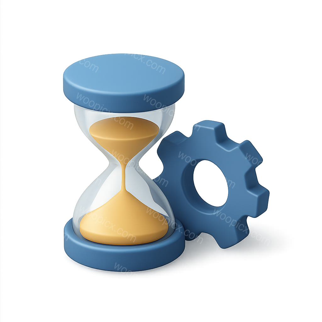 A 3D icon showcasing a blue hourglass with yellow sand and a blue gear. The design features a transparent background and is viewed from a three-quarter angle.