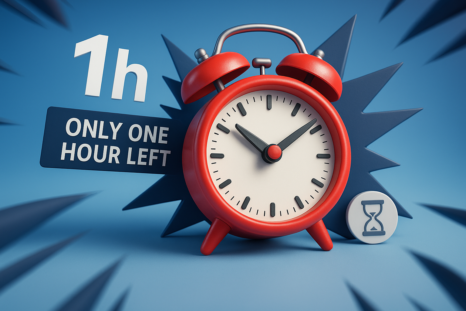 A 3D graphic featuring a red alarm clock emphasizing urgency with a countdown theme. Ideal for promotions or events with limited time offers.