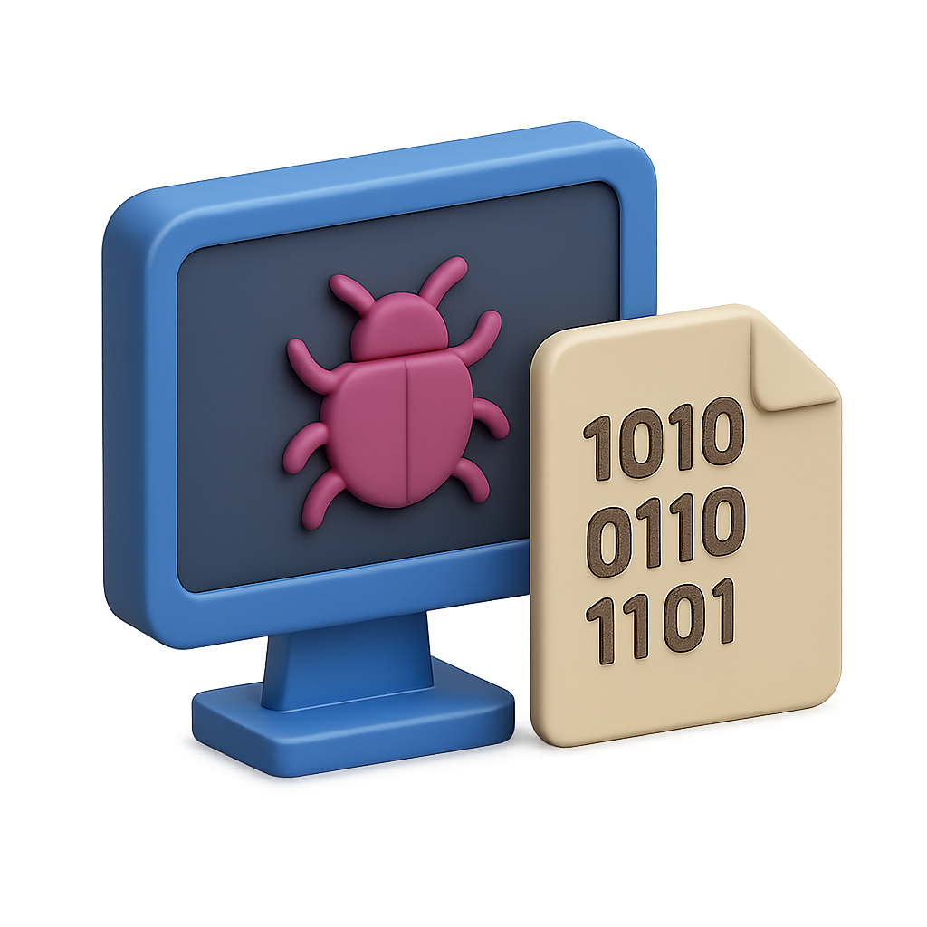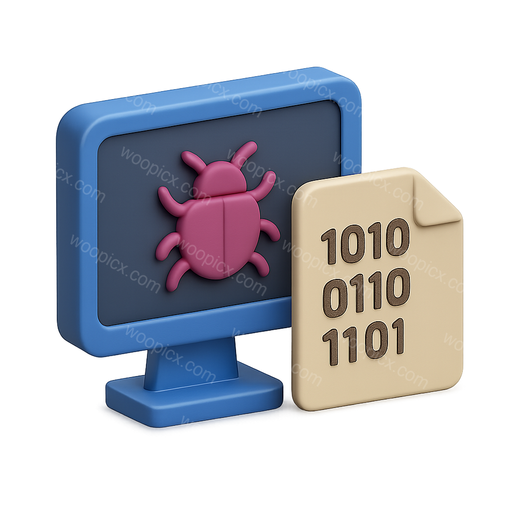 A stylized 3D icon featuring a computer monitor displaying a bug symbol, alongside a document with binary code. The design is isometric and volumetric with a transparent background.