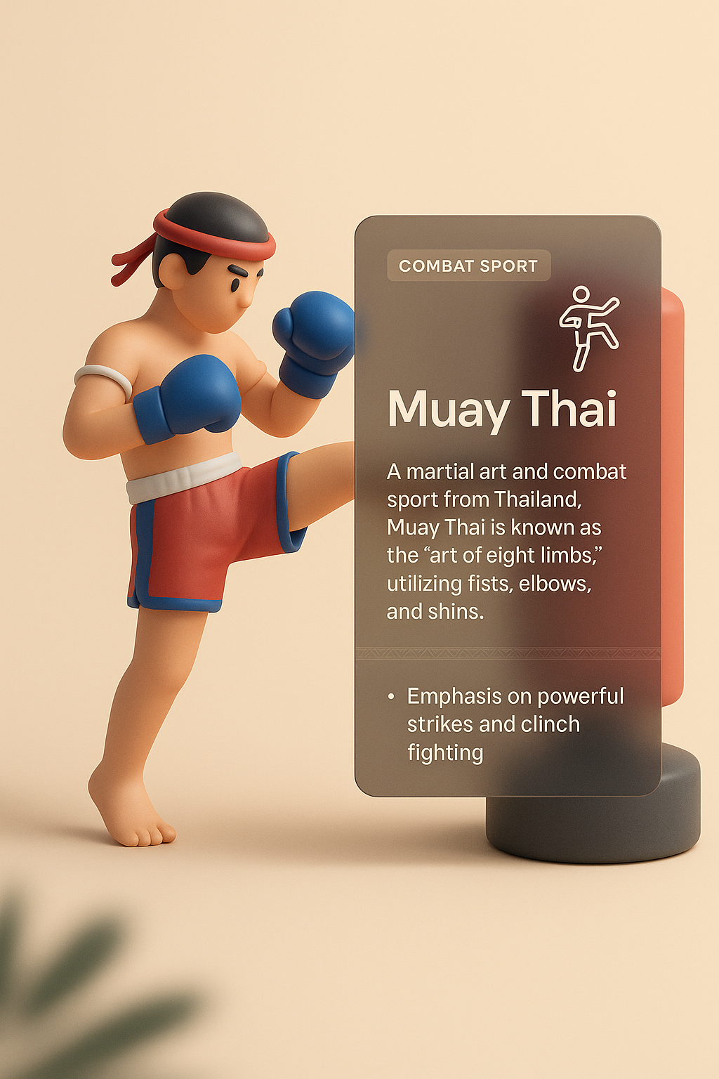 /Collection: /by davooda/Type: PNG/A visually appealing web design featuring a 3D illustration of a Muay Thai fighter. The design includes integrated information blocks with a light tone and stylish transparency effects.
