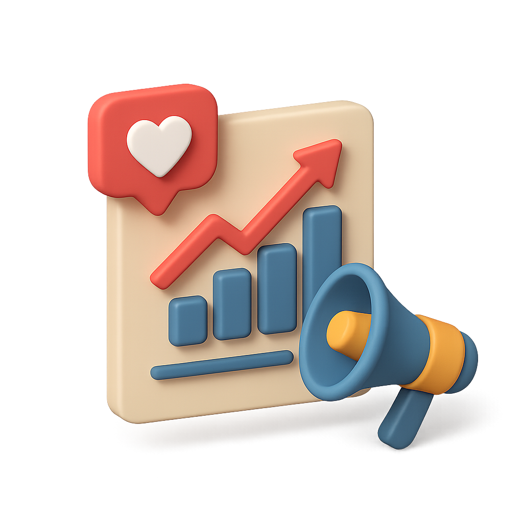 /Collection: /by davooda/Type: PNG/A visually appealing 3D icon representing social media marketing. It features a megaphone and a rising graph, symbolizing engagement and growth, set against a subtle gradient background.
