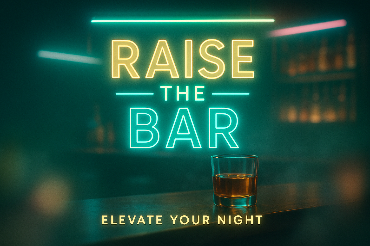 A visually striking bar scene illuminated by neon lights. The text 'RAISE THE BAR' glows prominently, accompanied by a glass of whiskey, creating a vibrant, inviting ambiance.