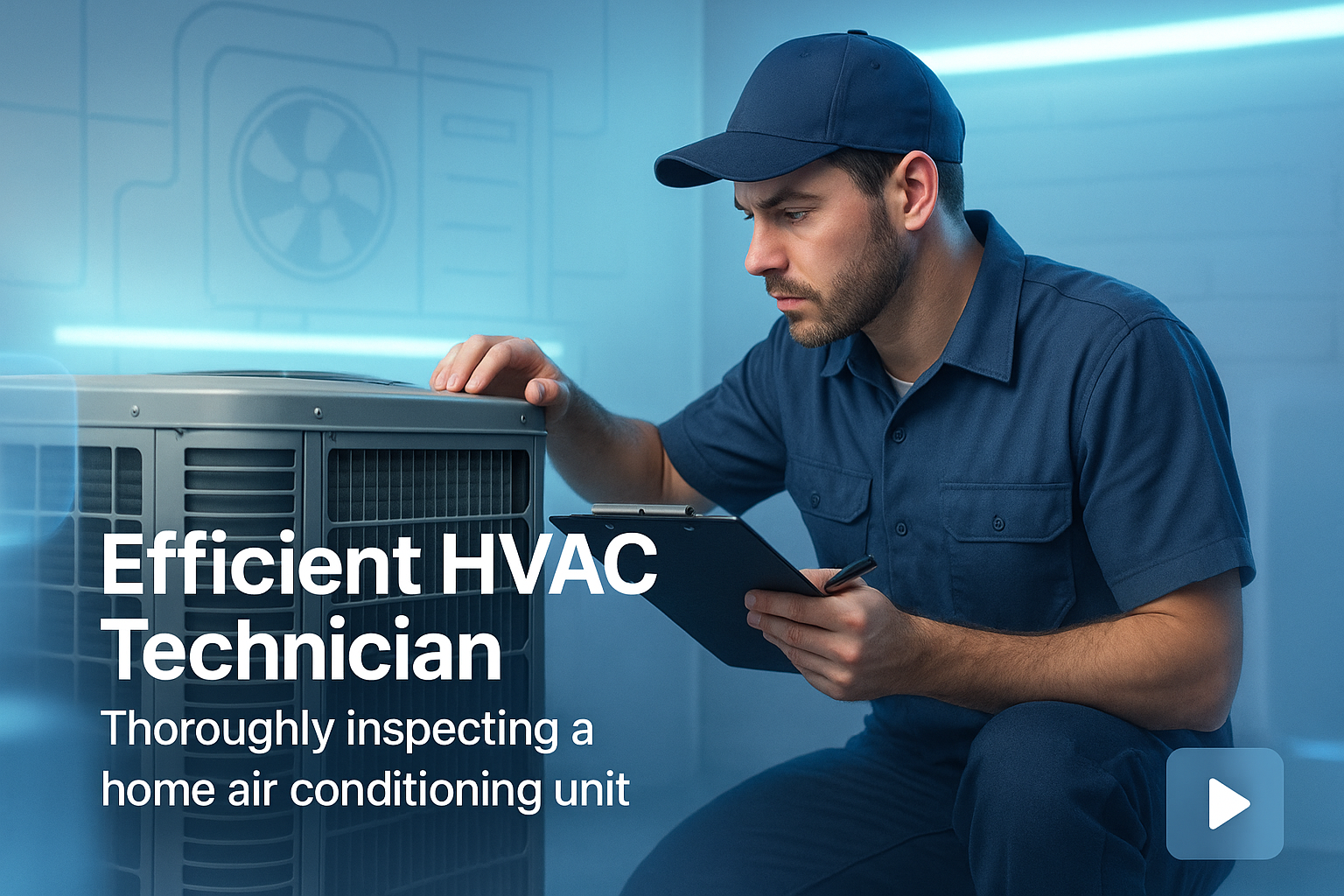 Professional image of an HVAC technician inspecting an air conditioning unit, featuring modern design elements and a focused expression, ideal for service promotion in the HVAC industry.